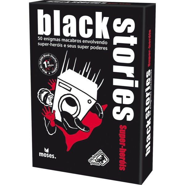 Black Stories edição Super-Heróis oferece 50 enigmas macabros inéditos envolvendo super-heróis e super-equívocos: identidades secretas reveladas, super-mulheres com sede de vingança, voos embriagados e muitas outras coisas que só se podem encontrar no universo dos super-heróis (com a garantia de um teor trágico e sinistro típico das black stories).