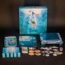 | Componentes | 36 Cartas de Oceano transparentes 1 quadro das profundezas para ser montado 4 Tabuleiros de Mergulhador 4 Fichas de Concha (1 de cada cor) 4 Escudos 1 Trilha de Descida 4 Peões de Mergulhador (1 de cada cor) 20 Marcadores de Ar Numerados (4 cópias dos valores 1.2. 5, 4 e 5) 8 Peças de Companhia 1 Peão de Mergulhador preto, para o chefe da vila 48 cartas do Chefe da Vila 2 Fichas de Bolha 1 livro de regras 1 tapete de jogo |