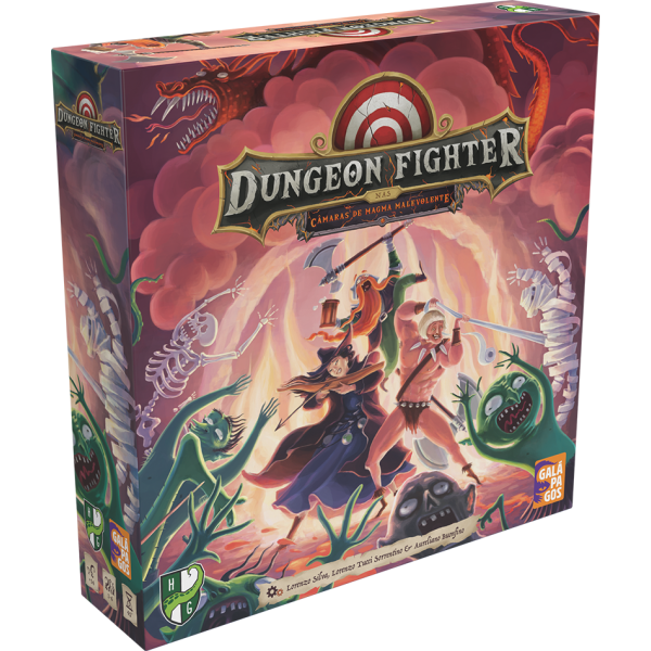 | Componentes | 1 Tabuleiro-Alvo 12 Dados de 8 lados (3 coloridos e 9 brancos) 2 Dados especiais (1 dado de pedra e 1 de metal) 4 Folhas de Herói 69 Cartas (21 Monstros, 3 Chefões, 21 Masmorras, 24 Equipamentos) 30 Moedas de Ouro de Plástico 6 Marcadores de Vida (2 de Monstros e 4 de Heróis) 3 Objetos de Plástico (Vulcão, Anel de Fogo, Muralha de Fogo) e 1 Tapete de Lava 4 Esquemas de Papelão (Bola de Fogo, Escudo e 2 Explosões), 1 Peça de Baú e mais de 20 fichas de jogo |