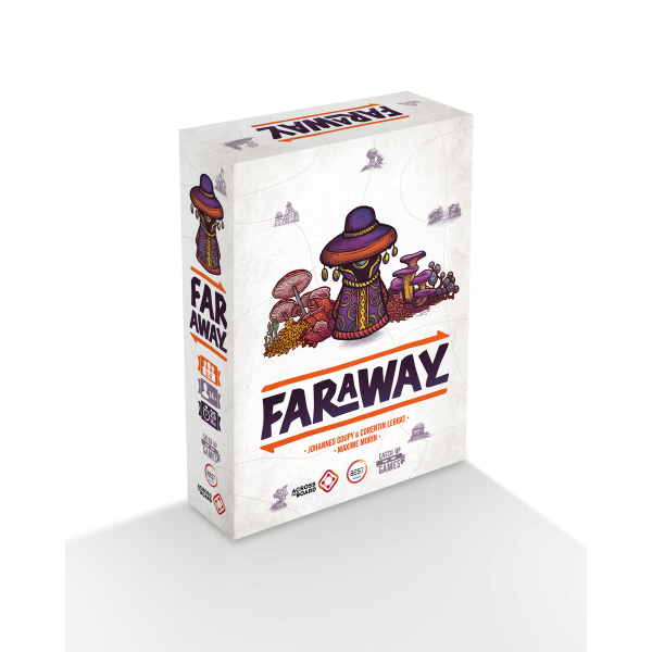 A cada turno, você joga uma carta de uma mão de 3. Em seguida, você escolhe uma nova carta de um rio virado para cima. Como o jogo é simultâneo em Faraway, você deve levar em consideração um sistema inteligente de prioridades em todas as suas escolhas – ser o último a escolher uma carta deixa você com menos opções e muitas vezes escolhas menos lucrativas para os próximos turnos.