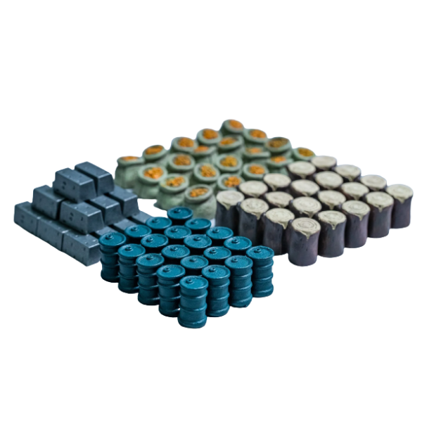 20 Grain sacks (comida) 20 Iron ingots (metal) 20 Oil barrels (óleo) 20 Chopped Wood (madeira) |