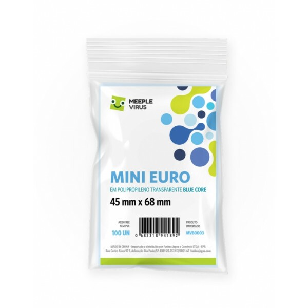 Pacote com 100 protetores de Cartas Meeple Virus (Blue Core) para cartas no tamanho 45mm x 68mm.