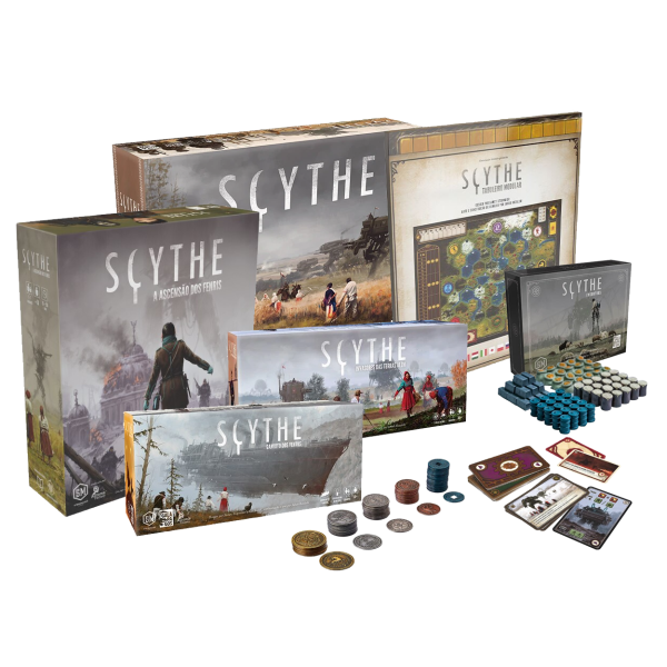 | Componentes | Este combo inclui: Scythe (jogo base) Scythe: Invasores da Terra Além (expansão) Scythe: Gambito dos Ventos (expansão) Scythe: A Ascensão do Fenris (expansão) Scythe: Encontros (expansão) Scythe: Tabuleiro modular Scythe: Recursos Realistas Scythe: Moedas de Metal Scythe: Promo Cards Set |